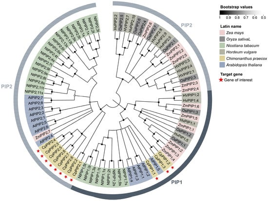 Phylogenetic relationships of PIPs genes in A. thaliana, Z. mays, O. sativa, N. tabacum, H. vulgare, and C. praecox.