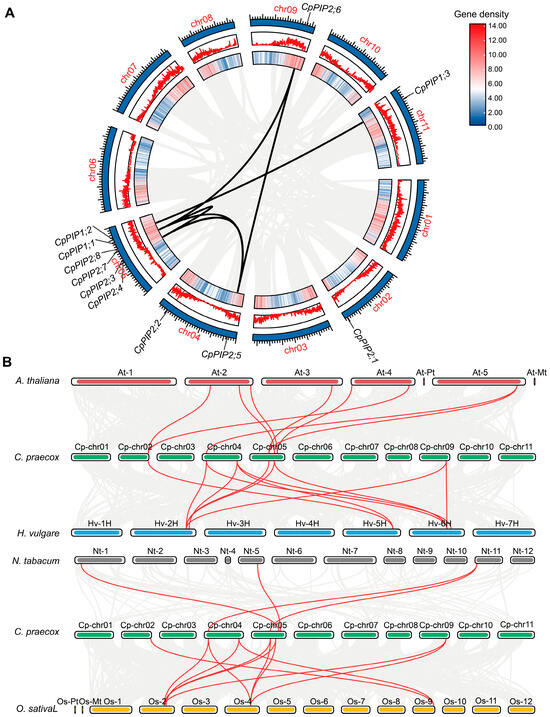Synteny analysis of PIP genes. (A) Syntenic relationship of CpPIPs in C. praecox genome. (B) Synteny relationship of PIP genes between C. praecox and A. thaliana, Z. mays, O. sativa, N. tabacum, and H. vulgare.