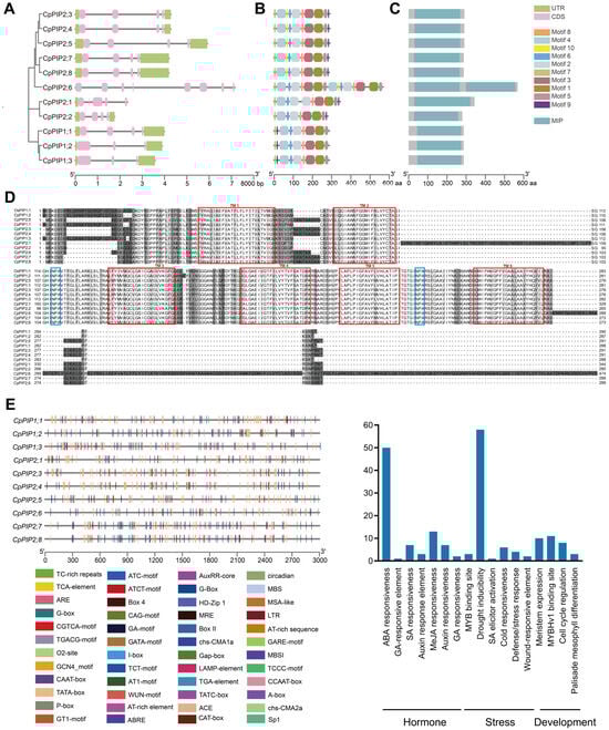 Among the identified genes, CpPIP2;6, a tandemly duplicated gene, contains the largest number of exons (8), whereas a majority of the CpPIPs comprise four exons (Figure 3A). Motif analysis revealed that most of the CpPIPs contain motifs 1–8, whereas CpPIP1, CpPIP2;1, and CpPIP2;2 lack motif 10 (Figure 3B), and conserved domain analysis indicated that CpPIP2;6 contains two MIP domains, whereas the remaining ten CpPIP members each harbour a single MIP domain (Figure 3C). Furthermore, multiple sequence alignments of the CpPIPs revealed a high similarity between these sequences, as indicated by the presence of six conserved transmembrane domains and two nucleosome assembly Asn-Pro-Ala (NPA) motifs (Figure 3D). To assess the potential physiological roles of CpPIPs genes, we performed in silico analysis on the 3000-bp region upstream of the promoter sequences of these genes. Among the 11 CpPIP promoters, we identified a total of 219 cis-acting regulatory elements, which could be functionally categorized into hormone responsiveness, plant growth and development, and stress adaptation types (Figure 3E). Notably, all 11 CpPIPs promoters harbour at least one drought-responsive cis-element, thereby providing evidence to indicate their functional involvement in abiotic stress responses. The quantitative distributions of these regulatory elements are presented in Table S5.