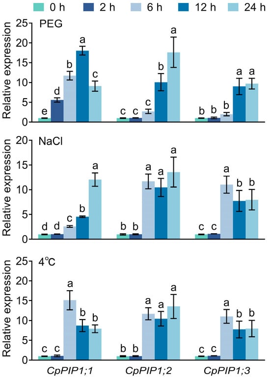 qRT-PCR analyses of relative expression of CpPIP1 genes of wintersweet under stress. Relative expression of CpPIP1;1, CpPIP1;2, and CpPIP1;3 in leaves treated with 20% PEG6000, 300 mM NaCl, and 4 °C at 0, 2, 6, 12, and 24 h, respectively. A one-way ANOVA was conducted, followed by Duncan’s multiple range test, p < 0.01. Different lower-case letters above bars denote a significant difference between treatment time points.