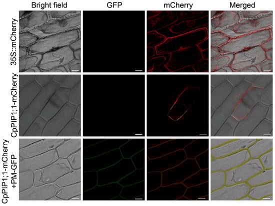 Subcellular localization of CpPIP1;1-mCherry in onion epidermal cells. The red fluorescence indicates the location of CpPIP1;1 within the epidermal cells. 35S::mCherry: positive control. White scale bars denote 50 µm.