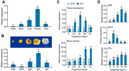 Relative expression level of CpPIP1;1 in wintersweet. (A) CpPIP1;1 expression in different tissues. (B) CpPIP1;1 expression during different periods of flowering. FBP, flower bud period; DPP, display petal period; IBP, bloom initiation period; BP, bloom period; WP, withering period. (C) Characterization of CpPIP1;1 expression in low-temperature treatments during flower development in wintersweet. Different lower-case letters above bars indicate significant differences between different time points for the same treatment at the p < 0.01 level. (D) The expression profiles of CpPIP1;1 in response to hormone treatments were analysed in six-leaf stage of wintersweet plants exposed to 50 µM ABA, 70 µM MeJA, and 70 µM GA3, respectively. RNA was extracted from the leaves at 0, 2, 6, 12, and 24 h post-treatment. One-way ANOVA followed by Duncan’s multiple range test, p < 0.01.
