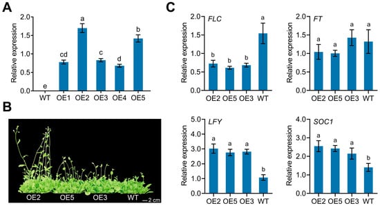 Analysis of three homozygous CpPIP1;1 overexpression lines (OE2, OE5, and OE3), characterized by relatively high levels of transgene expression (Figure 7A), revealed that under standard growth conditions, compared with the WT plants, those of the OE2 line were characterized by a significantly earlier flowering phenotype (Figure 7B, Table S6). Whereas under these growth conditions, we detected no significant differences between CpPIP1;1-overexpressing and WT plants with respect to the relative expression of FLOWERING LOCUS T (FT); in contrast, there was a significantly elevated expression of SUPPRESSOR OF OVEREXPRESSION OF CO1 (SOC1) and LEAFY (LFY) in CpPIP1;1-overexpressing plants relative to that in WT plants. Conversely, there was a significant suppression of FLOWERING LOCUS C (FLC) expression in CpPIP1;1-overexpressing plants (Figure 7C).