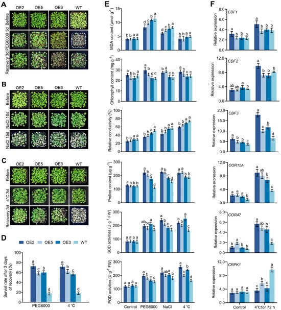 Overexpression of CpPIP1;1 enhances the stress tolerance of transgenic A. thaliana. (A) Performance of A. thaliana overexpressing CpPIP1;1 (OE lines) under 20% PEG6000 treatment. (B) Performance of A. thaliana overexpressing CpPIP1;1 (OE lines) under NaCl treatment. (C) Performance of A. thaliana overexpressing CpPIP1;1 (OE lines) under 4 °C treatment. (D) Survival of A. thaliana wild-type (WT) and CpPIP1;1-overexpressing transgenic lines following PEG6000 and low-temperature treatment after 3-day recovery period. (E) Chlorophyll content, MDA content, relative conductivity, proline content, and SOD and POD activities in WT and OE lines under different treatments. (F) Relative expression of endogenous cold stress-responsive genes in A. thaliana. WT: Col-0 ecotype; OE1–OE5: CpPIP1;1-overexpressing lines. Different lower-case letters above bars denote significant difference between lines for the same treatment (p < 0.05).
