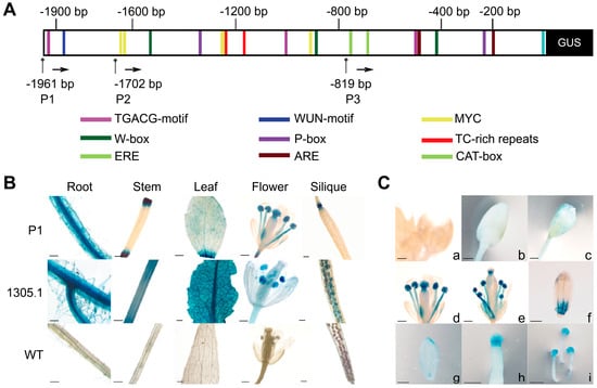 GUS histochemical staining of CpPIP1;1pro-P1::GUS in transgenic A. thaliana lines. (A) Schematic representation of the CpPIP1;1 promoter and deletion fragment. P1, CpPIP1;1pro-P1; P2, CpPIP1;1pro-P2; P3, CpPIP1;1pro-P3. (B) P1, GUS activity driven by the CpPIP1;1pro-P1 in transgenic A. thaliana; 1305.1, GUS activity in transgenic A. thaliana driven by the 35S promoter of pCAMBIA1305.1; WT, wild type A. thaliana plants. (C) a, young floral buds; b, floral buds; c, flower initiation; d, blossoming flower; e, senescent flower; f, sepal of the blossoming flower; g, petal of the blossoming flower; h, pistil of the blossoming flower; i, stamen of the blossoming flower. Black scale bars denote 2 mm.
