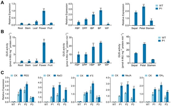 Quantitative detection of the relative expression of GUS and GUS activity in transgenic tobacco. (A) Relative expression of the GUS gene was assessed among different tissues, at different stages of flowering, and within floral organs during the bloom period of transgenic tobacco. FBP, flower-bud period; DPP, display petal period; IBP, bloom initiation period; BP, bloom period; WP, withering period. (B) Quantitative analysis of GUS activity in different tissues of transgenic tobacco, in flowers at different stages of flowering, and in floral organs during the bloom period. (C) Expression profiles of GUS in response to abiotic stress and hormone treatments. Tobacco was exposed to 20% PEG6000, 300 mM NaCl, 4 °C, 100 µM MeJA, or 100 µM GA3. CK, transgenic plants that underwent no intervention. RNA was extracted from the leaves at 48 h after treatment. P1, CpPIP1;1pro-P1; P2, CpPIP1;1pro-P2; P3, CpPIP1;1pro-P3. (* p < 0.05, ** p < 0.01).