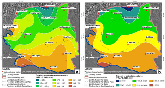 The mean values (1961–2020) of the considered parameters and of the two applied indices reveal a good suitability of Oltenia to obtain QRW, especially in its southern half. Thus, the average values of GST exceed 19 °C in the southern and eastern parts of the plain, which correspond to Swr (19.2 °C). The average for MOHwr is lower, 17.9 °C, as this wine-growing region has a greater altitudinal range (about 300 m) compared to Swr (70 m) and it includes plain, piedmont, and Subcarpathian areas. The highest value is registered in the southwestern extremity, at Dr.-T. Severin (19.4 °C), and the lowest in the north, at Polovragi (16.3 °C) (Figure 2a).