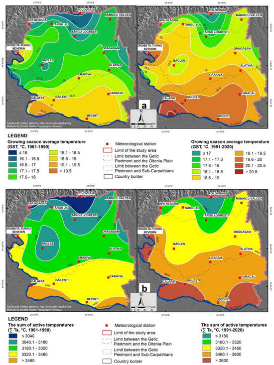 Most of Swr already exceeded 19.5 °C GST, which means daily maximum temperatures often reach 35–40 °C and daily minimum temperature remains above 20 °C in summer, especially in July and August [41], which have a greater contribution to the growing season temperature compared to the other months. July and August coincide with the veraison period, extremely high temperatures thus affecting the optimum development of grapevine and berries. The summer of 2024 was relevant from this viewpoint. Calafat and Dr.-T. Severin registered the highest mean annual temperature in the country, i.e., 14.9 °C (+3 °C, respectively, +2.8 °C above the mean value of 1961–2020) [116]; there were more than 15 days with maximum temperature ≥35 °C in southern Oltenia and along the Jiu and the Olt Valleys up to the Subcarpathian in July [117] and between 16 and 20 such days in southwestern Oltenia in August [118]; there were 24 cases of daily maximum temperatures ≥40 °C. In the interval of 1991–2020, ∑Ta exceeded 3600 °C in the proximity of the Danube River, which means +213.2 °C at Dr.-T. Severin and +205.8 °C at Calafat compared to the previous interval. This increase in the sum of active temperatures at the regional level (+194.2 °C in case of MOHwr and +181.4 °C for Swr) is consistent with the one identified by Irimia et al. [51] for the periods of 1961/1990 and 1990/2013 (+187 °C for the MOHwr and 190 °C for the Swr), based on ROCADA database.