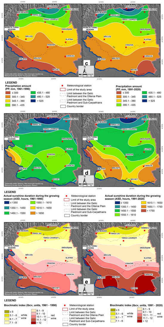 Spatial distribution of GST (a), ∑Ta (b), PP (c), ASD (d), Ibcv (e), and IAOe (f) average values in Oltenia wine-growing region for the periods of 1961–1990 (left column) and 1991–2020 (right column).