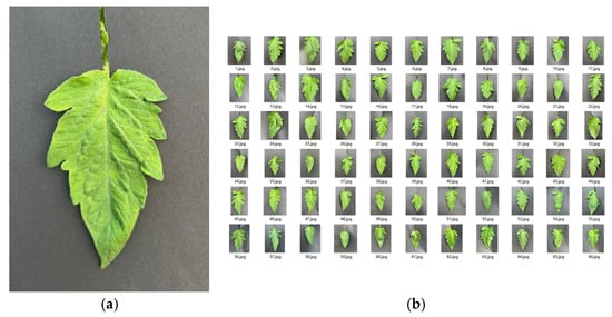 Captured images of tomato leaves. (a) Original image. (b) Image dataset.