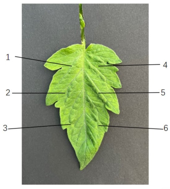 Leaf measurement points. The numbers 1–6 in the image represent Sampling Points 1 to 6, respectively.