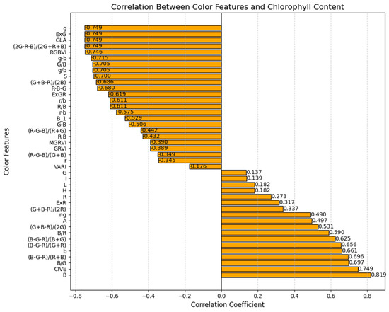 The Pearson correlation between color features and chlorophyll content was analyzed. The Pearson correlation coefficient ranges from −1 to 1, where a positive value indicates a positive correlation, meaning the two variables change in the same direction, while a negative value indicates a negative correlation, meaning the two variables change in opposite directions. By converting RGB, HSI, and Lab color spaces and applying algebraic operations, 42 color features were calculated. The results of the correlation analysis with SPAD values are shown in Table 2.