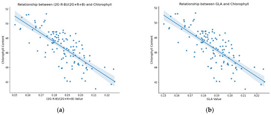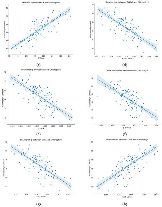 Based on the 42 color features mentioned above, it was found that B, (2G − R − B)/(2G + R + B), GLA, RGBVI, g, g − b, ExG, and CIVE values exhibit a strong correlation with SPAD values. Among them, the B value exhibits a correlation of 0.82 with the SPAD parameter. The scatter plots and regression lines between these eight color features and chlorophyll content are shown in Figure 6.