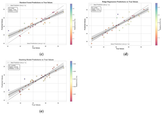 Regression scatter plot of predicted vs. measured values. (a) MLR estimation scatter plot. (b) SVR estimation scatter plot. (c) RF estimation scatter plot. (d) RR estimation scatter plot. (e) Stacking estimation scatter plot.