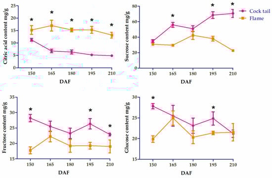Sugar and acid content of two varieties of grapefruit in different developmental stages. The asterisk (*) indicates significant differences (p < 0.05).