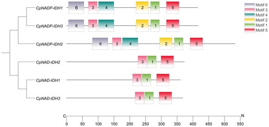 The conservative motif analysis of IDH. Six motifs were identified in the CpIDH protein and marked by different colors. The sequences of the conserved motifs are listed in Supplementary Table S4.