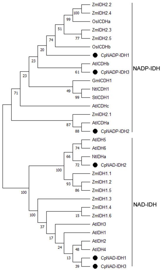 In this study, a total of six genes encoding IDH in grapefruit were identified. The numbers of IDH family members of Arabidopsis, rice, sorghum, and maize were 10, 7, 9, and 11, respectively. This interspecific variation likely resulted from divergent evolutionary selection pressures and specific gene duplication events. Physical and chemical property analyses showed that the amino acid number, molecular weight, isoelectric point, and hydrophilicity of the six candidate IDHs were similar to those of the plants, indicating that IDH was conservative among different species. According to the conservative motif prediction, gene structure, and phylogenetic tree analysis, the six candidate genes encoding citrus IDH can be divided into two categories: CpNAD-IDH and CpNADP-IDH. The study of maize suggests that all ZmNADP-IDHs are predicted to be located in the cytoplasmic fraction, while all ZmNAD-IDHs are predicted to be located in the mitochondrial fraction [21]. In total, 29 IDHs from different species were divided into NAD-dependent IDH and NADP-dependent IDH, which suggested that IDH was relatively conserved during plant evolution. However, in phylogenetic tree analysis, 13 out of 29 bootstrap values were below 70, which indicated that the amino acid sequences of IDH varied greatly among different species. A similar result was also found in the study of the IDH gene family in maize [21]. The evolution difference might be caused by the diversity of citric acid content among different species. Tissue expression analysis showed that CpNAD-IDHs were mainly expressed in citrus roots, suggesting that NAD-IDH may be involved in citrus root growth and development. Meanwhile, CpNADP-IDHs were highly expressed in leaves, fruits, and roots, and the expression level in mature fruits was higher than that in young fruits, suggesting that CpNADP-IDH might play important regulatory roles in citrus fruit ripening. Studies on other crops found that IDH regulated fruit development and ripening. For example, NADP-ICDH presented incremental expression levels during peach fruit softening along with a concomitant decrease in organic acid content [17]. In tomato, SlICDH1 is involved in fruit ripening via ethylene regulation [33].