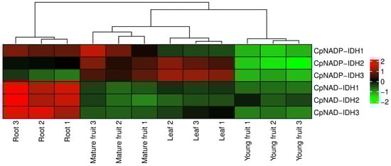 The expression characteristics of IDHs in different tissues (root, leaf, young fruit, and mature fruit) of citrus. Different numbers represent three replicates.