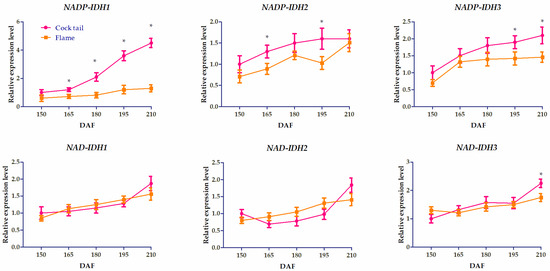 To investigate the biological function of IDH in citrus, the expression characteristics of IDH in leaf, root, and fruit were analyzed using RPKM values from the public database through a heatmap (Figure 5). CpNADP-IDH1 was expressed highly in the root and mature fruit. The expression of CpNADP-IDH1 and CpNADP-IDH1 was higher in mature fruit and leaves. CpNAD-IDH1, CpNAD-IDH2, and CpNAD-IDH3 were expressed highly in the root. These results indicated that IDHs played important roles in citrus leaf, root, and fruit growth. To further investigate the gene function of IDH in citrus ripening, IDH expression in ‘Cock tail’ and ‘Flame’ grapefruit at five stages were analyzed using qRT-PCR (Figure 6). The results showed that the expression of CpNADP-IDH1 increased gradually during the ripening process and peaked at 210 DAF. In addition, the expression level of CpNADP-IDH1 in ‘Cock tail’ grapefruit was significantly higher than that in ‘Flame’ grapefruit. The other five genes encoding IDH were not significantly different between the two grapefruit varieties. These results suggested that CpNADP-IDH1 might be a key candidate gene for regulating citric acid content during citrus fruit ripening.