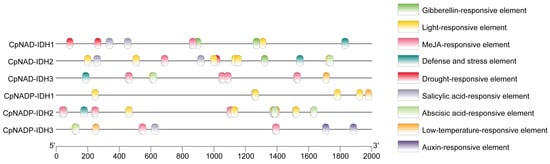 To clarify the function of IDH in citrus growth and fruit development, the cis-acting elements on the 2 kb promoter upstream of each IDH gene were analyzed. A total of 75 cis-acting elements were identified in six IDH genes, including 22 light-responsive elements, 4 low-temperature-responsive elements, 3 drought-responsive elements, 4 defense and stress elements, 10 abscisic acid-responsive elements, 2 auxin-responsive elements, 3 gibberellin-responsive elements, 22 MeJA-responsive elements, and 5 salicylic acid-responsive elements (Figure 7). These results suggested that the expression of IDHs in citrus might be regulated by environmental factors such as light, temperature, water, and plant hormones.