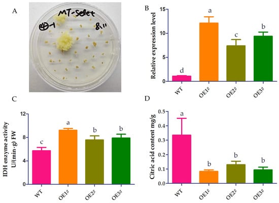 To further study the function of CpNADP-IDH1 in citric acid metabolism of citrus fruits, an overexpression vector pCAMBIA1300-35S-E9 was constructed and transformed into grapefruit callus using Agrobacterium GV3101. Three overexpression (OE) callus lines with high expression of CpNADP-IDH1 were screened using kanamycin selection and qRT-PCR (Figure 8A,B). The IDH enzyme activities in OE callus were significantly higher than those of the wild-type callus (Figure 8C). The citric acid content in transgenic and wild-type (WT) callus was determined. The results showed that the citric acid contents in the callus of the three transgenic lines were 0.08 mg/g, 0.13 mg/g, and 0.09 mg/g, respectively. These values were significantly lower than that in the WT callus (0.34 mg/g) (Figure 8D). These results indicated that overexpression of CpNADP-IDH1 could significantly reduce citric acid content in citrus.