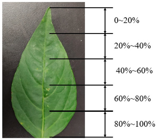 Segmentation of pepper leaves into different regions based on relative distance from the tip.