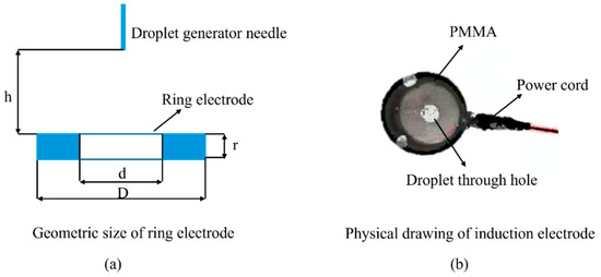 When the same voltage is applied to the ring electrode, droplets passing through different positions within the inner cavity of the electrode acquire different amounts of charge [34]. To ensure uniform charging, a composite PMMA induction electrode plate with a central circular hole (diameter 2.5 ± 0.1 mm) was designed (as shown in Figure 2), allowing each droplet to pass through the same region of the electrode. The applied charging voltages were set to 0, 14, 16, and 18 kV. All experiments were conducted in a sealed laboratory to eliminate interference from ambient airflow. Since the electric field near the needle tip can influence the surface tension of the liquid, it may cause variations in droplet size generated by the device [35]. After repeated testing, it was determined that when the distance between the needle tip and the induction electrode exceeded 12.0 mm, the size deviation between charged and uncharged droplets remained within 1%. Therefore, the distance h between the needle and the charging electrode was fixed at 15.0 mm.