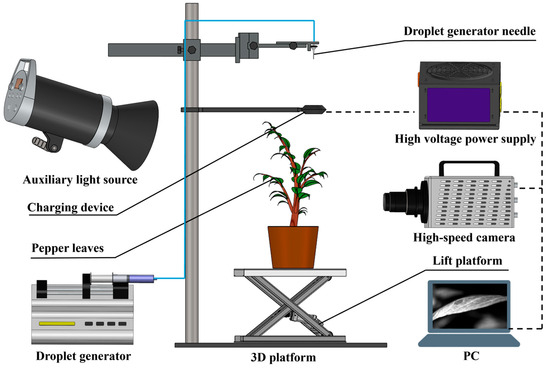 Pepper is a common and important vegetable in daily life. However, its yield is significantly reduced each year due to pest and disease infestations affecting pepper plants [1]. Currently, pesticide spraying remains one of the most effective methods for pest control in crops [2]. However, not all droplets sprayed from pesticide nozzles successfully reach the leaf surface; droplet drift and other losses often lead to considerable pesticide waste [3]. In response to this issue, electrostatic spraying has been explored. A series of studies have demonstrated that electrostatic spraying can effectively reduce droplet drift and thereby improve pesticide utilization efficiency [4,5]. Nevertheless, even when charged droplets reach the target surface, they may still exhibit splashing, rebounding, or adhesion behaviors [6,7]. Among these, splashing and rebounding hinder the effective deposition of droplets on the target surface, whereas only adhesion ensures that droplets remain on the leaf surface [8]. Therefore, studying the impact behavior of charged droplets on pepper leaves is essential for understanding the wetting mechanism of charged droplets on leaf surfaces, which provides theoretical guidance for enhancing the efficiency of electrostatic spraying.