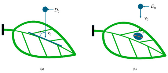 Due to the flexible nature of pepper leaves, different parts of the leaf exhibit varying inclination angles under natural growth conditions. As shown in Figure 1, four impact positions were selected based on their relative distance from the leaf tip as follows: 20%, 40%, 60%, and 80%. As shown in Figure 4a, the leaf was maintained in its natural orientation during the droplet impact experiments. The average inclination angles at the 20%, 40%, 60%, and 80% positions were measured to be 20.1°, 18.4°, 15.2°, and 11.7°, respectively. Accordingly, the calculated droplet impact angles (α) at these positions were 69.9°, 71.6°, 74.8°, and 78.3°, respectively.