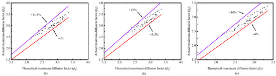To investigate the effect of applied voltage on droplet impact behavior, the theoretical model of the maximum spreading factor previously developed by our group [41] was employed. In earlier studies involving uncharged droplets, it was found that the theoretical predictions of the maximum spreading factor on pepper leaves were generally higher than the experimental results [42]. This discrepancy was attributed to the model’s omission of air resistance caused by leaf bending and the variation in surface wettability at different leaf positions. Despite this deviation, the model remains valid for evaluating the influence of droplet charging on impact dynamics. The experimental results obtained under different applied voltages revealed the relationship between the theoretical and measured maximum spreading factors for both uncharged and electrostatically charged droplets, as shown in Figure 5. The red and blue lines in Figure 5 represent the error margins between the experimental and theoretical values of the maximum diffusion factor of the droplets. Specifically, in Figure 5a, the +10% line (blue line) corresponds to 1.1 times the actual test value compared to the theoretical predicted value, while the −4% line (red line) is 0.96 times the theoretical predicted value. In Figure 5b, the +11.5% line (blue line) represents 1.15 times the actual test value, and the 1:1 line (red line) indicates equality between the actual test value and the theoretical predicted value. In Figure 5c, the +12% line (blue line) is 1.12 times the actual test value, while the −3.5% line (red line) is 0.97 times the theoretical predicted value. From the experimental results, it can be observed that when the applied voltage is 14 kV, the error deviation between the theoretical and actual values ranges from −4% to 10%. As the applied electric field voltage increases, the theoretical model’s predicted value gradually exceeds the actual measured value. This phenomenon occurs because electrostatic droplets spread over a larger area than non-electrostatic droplets. In this study, the maximum spreading factor of charged droplets upon impact with pepper leaves was found to increase, indicating that droplet charging enhances wettability on the leaf surface. This observation is consistent with the findings of Chen et al. [43], who reported that electrostatic charging reduces the surface tension of droplets and decreases the contact angle on the leaf surface, thereby improving their wettability.