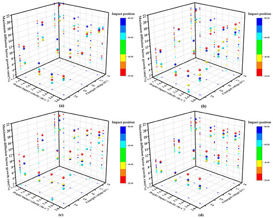 The projections of the droplet maximum diffusion factor growth rate values on different surfaces in Figure 6 illustrate the correlation between each factor and the droplet’s maximum diffusion factor growth rate. The colors of the data points reflect the relationship between the droplet maximum diffusion factor and the impact location. From Figure 6, it is evident that the growth rate of the maximum diffusion factor for electrostatic droplets exhibits a clear positive correlation with the charging voltage compared to uncharged droplets. Additionally, the growth rate of the maximum diffusion factor first decreases and then increases with the droplet impact velocity. A slight increase in the growth rate is observed at an impact velocity of 2.750 m/s. This phenomenon may be related to the droplet approaching the splash threshold, with some droplets breaking through the boundary layer and fragmenting slightly. The growth rate of the maximum diffusion factor does not show a significant correlation with the impact location. This lack of correlation may be attributed to the varying dielectric constants of different parts of the leaf, leading to a more unpredictable effect on the charged droplets. Furthermore, the growth rate of the maximum diffusion factor is negatively correlated with the droplet particle size.