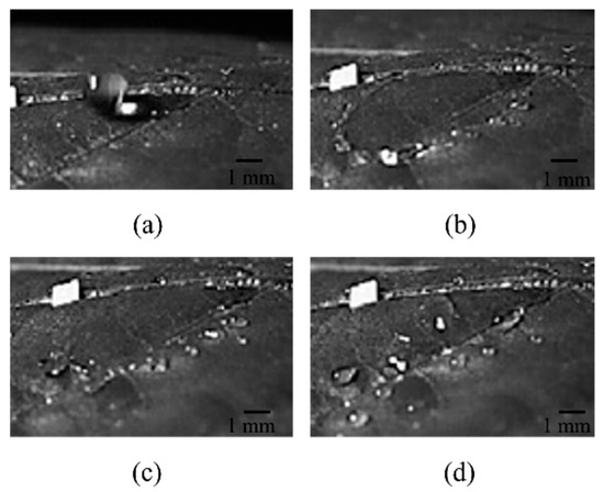 The effect of different charging voltages on the splash threshold of droplets was investigated by comparing the impact behavior of charged and uncharged droplets. It was found that, although charging the droplets leads to splashing, the fine droplets generated during the splash are more likely to adhere to the leaf surface, as shown in Figure 7.