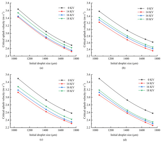 Critical splashing velocity of droplets at different charging voltages impacting pepper leaves at (a) 20% of the distance to the leaf tip, (b) 40% of the distance to the leaf tip, (c) 60% of the distance to the leaf tip, and (d) 80% of the distance to the leaf tip.