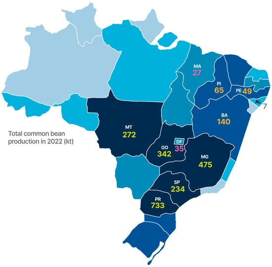P. vulgaris is produced year-round in Brazil, in three cropping seasons: rainy season (October–January), dry season (February–April), and winter season (May–August). An important part of the common bean production in Brazil is carried out by small farmers, like in other developing countries [6]. The average common bean yield is about 750 kg/ha in these smallholder farms [7]. In contrast, a major part of the Brazilian production is carried out in large areas, with the intensive use of technologies, such as central pivot irrigation, mostly in the winter season, with average yield over 4000 kg/ha [7]. There is, therefore, a variation in the cropping systems and technology adoption, which impact the yield, quality, and the cost–benefit of the common bean production chain.