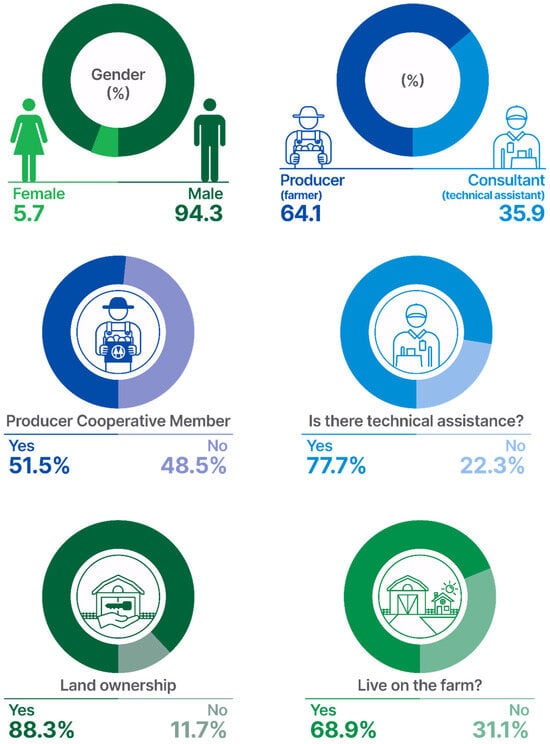 In total, we received 103 responses, most of them (64.1%) directly from common bean producers. A smaller number of interviewees (35.9%) were agronomists responsible for technical assistance in the common bean production area on large and small farms. Most respondents were males (94.3%), common bean producers and declared to have technical assistance in the crop production (Figure 2). The percentage of respondents who are cooperative members (~51%) was not significantly different than that of non-members. Although the number of IPM adopters among the cooperative members was higher, there was no significant effect of cooperative membership on the IPM adoption rate. The percentage of respondents participating in a cooperative did not differ significantly across farm size classes, ranging from 42% to 60%. Interestingly, although most of the respondents own their land, it has become common in different Brazilian regions for farm owners to not live on the farm, but rather in a nearby town.