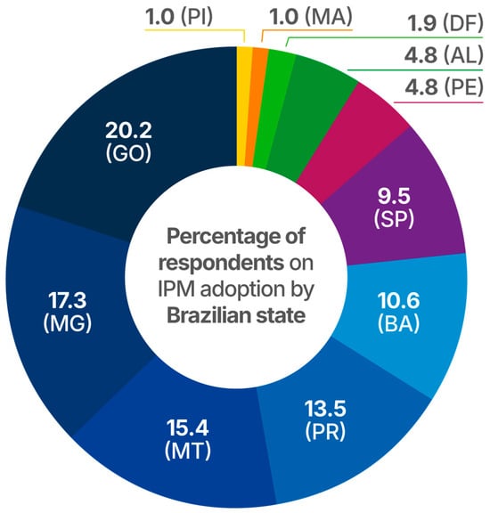 Percentage of respondents to the survey on IPM adoption in pest management in common beans by Brazilian state (GO: Goiás, SP: São Paulo, BA: Bahia, PR: Paraná, MT: Mato Grosso, MG: Minas Gerais).