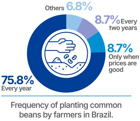 Finally, most respondents expressed interest in adopting automated technologies and implementing IPM, provided the associated costs are manageable and there is potential for added value—an observation consistent with findings from other IPM adoption surveys [18,36]. One example of such added value is the quality certification of common beans produced under IPM guidelines, which emphasizes the reduced use of chemical insecticides, minimizes environmental impact, and offers a healthier product to consumers. The development and widespread recognition of a certification seal could serve as a valuable tool to enhance the market appeal of sustainably produced beans. In Brazil, an integrated production system for common beans was developed to promote the sustainability, traceability, and certification of production practices [37]. However, despite its potential, this system has not been widely adopted—likely due to insufficient government incentives and a lack of supporting public policies.