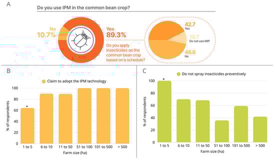 Pest management practices among common bean farmers in Brazil. (A) Reported adoption of integrated pest management (IPM) by all respondents; (B) IPM adoption by respondents stratified by farm size (ha); and (C) percentage of respondents, by farm size, who reported not applying insecticides on a calendar-based schedule. * Statistically significant difference observed by the chi-square test (p < 0.001).