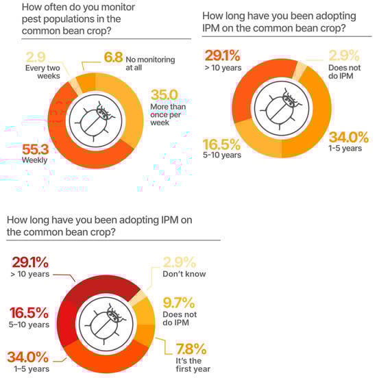 From the 89% of farmers that claim to use IPM in the common bean crop, 34.0% have used it for 1–5 years, 16.5% for 5–10 years, and 29.1% for over 10 years (Figure 7). Most respondents (55.3%) monitor the crop once weekly, while 35.0% monitor more than once per week and 2.9% every two weeks. Typically, the IPM strategy suggests weekly monitoring, but different frequencies may be used depending on the situation. For example, in cases of increasing infestations, it may be necessary to monitor the crop more frequently, such as twice a week.