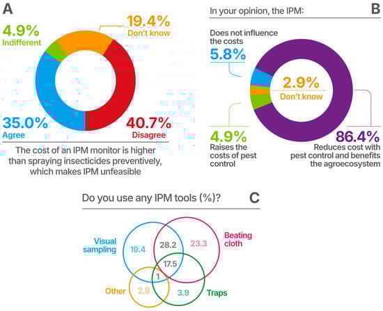 Use of IPM tools in the common bean crop in Brazil and farmers’ perception of costs associated with IPM. (A) Perception of costs associated with hiring an IPM monitor; (B) perception of costs associated with IPM; and (C) frequency of farmers that adopt one or more IPM tools for crop monitoring.