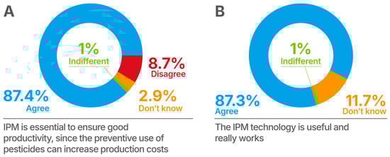 In our survey, the percentage of respondents who consider the cost of hiring an IPM monitor to be worth it in relation to the preventive application of insecticides is similar to the percentage of those who think otherwise (40.8% vs. 35%) (Figure 8A). This result shows that the perception of costs of a large percentage of farmers do not consider medium and long-term environmental costs, as if the two different strategies (monitoring the pest population to decide whether to apply insecticides versus applying insecticides preventively) were interchangeable. Also, it is remarkable that almost one fifth of the respondents do not know what their costs are with pest monitoring (Figure 8A). Interestingly, at the same time, a great majority of the respondents (86.4%) agreed that IPM reduces the costs related to pest control and benefits related to the agroecosystem, which indicates that farmers are aware of the benefits of reducing the use of insecticides (Figure 8B).
