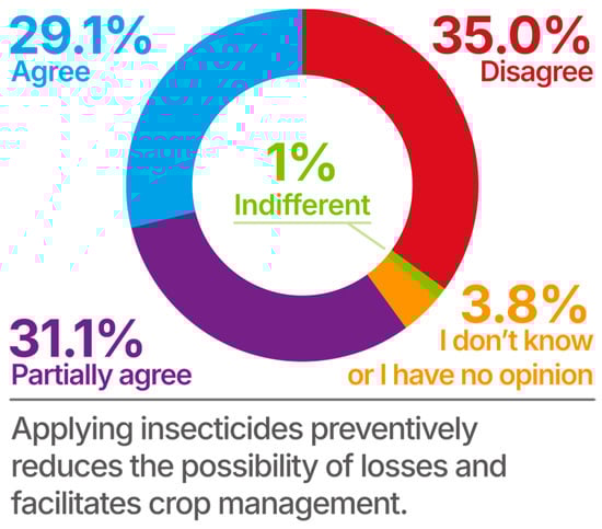 Although a high percentage of respondents said they do not use IPM on the common bean or on the other crops (about 47%), most respondents believe that adopting IPM is essential to ensure good productivity (87.4%), in addition to being useful and effective (87.4%) (Figure 9). The great majority (94.2%) of the respondents agree that agriculture management techniques such as crop rotation and succession influence the occurrence of pests in the common bean crop. However, when asked about the potential of preventively applying insecticides to reduce crop losses, opinions are divided, with similar percentages of respondents agreeing, disagreeing, or partially agreeing (Figure 10).