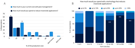 Current pest management costs reported by Brazilian common bean producers and consultants, along with the estimated percentage of production costs they would be willing to invest in sustainable pest management techniques. (A) Percentage of total respondents. * Statistically significant differences among columns of the same color observed by the chi-square test (p < 0.001). (B) Percentage of respondents by farm size. ** Statistically significant differences within the same column observed by the chi-square test (p < 0.001).