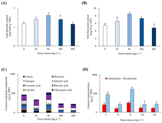 Effects of YE elicitation on accumulation of bioactive compounds. (A) Total phenolic content, (B) Total flavonoid content, (C) Content of several phenolics as per HPLC analysis, and (D) Content of polyacetylenes as per HPLC analysis. Cultures were elicited after 4 weeks with 0, 25, 50, 100, and 200 mg L−1 YE. Values followed by the same letter within the columns are not significantly different at p ≤ 0.05 using DMRT.
