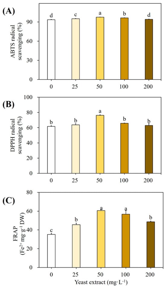 Antioxidant activity of plantlet extracts elicited with various YE concentrations. (A) ABTS radical scavenging, (B) DPPH radical scavenging, and (C) FRAP activities. Cultures were elicited after 4 weeks with 0, 25, 50, 100, and 200 mg L−1 YE. Values followed by the same letter within the columns are not significantly different at p ≤ 0.05 using DMRT.