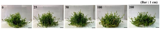 Lobelia chinensis Lour. axenic cultures, which are maintained at the Department of Horticultural Science at Chungbuk National University in the Republic of Korea, were utilized to initiate the experiment. To maintain the cultures, the nodal explants were sub cultured every four weeks and regenerated via organogenesis [9]. The plantlets of L. chinensis were maintained on Murashige and Skoog (MS) [19] medium supplemented with 3% sucrose (w/v) and 7 g L−1 agar. The hydrogen ion concentration (pH) was adjusted to 5.8 before autoclaving. The cultures were maintained at 25 ± 2 °C with 70% relative humidity, a 16/8 h photoperiod, and 40 µmol m−2 s−1 light intensity (fluorescent lamps). After four weeks of culture, 1.5 cm stem segments containing two nodes with alternating leaves and no roots (explants) were used as the experimental material.