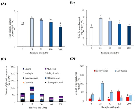 Effect of SA elicitation on accumulation of bioactive compounds. (A) Total phenolic content, (B) Total flavonoid content, (C) Content of several phenolics as per HPLC analysis, and (D) Content of polyacetylenes as per HPLC analysis. Cultures were elicited after 4 weeks with 0, 25, 50, 100, and 200 µM SA. Values followed by the same letter within the columns are not significantly different at p ≤ 0.05 using DMRT.