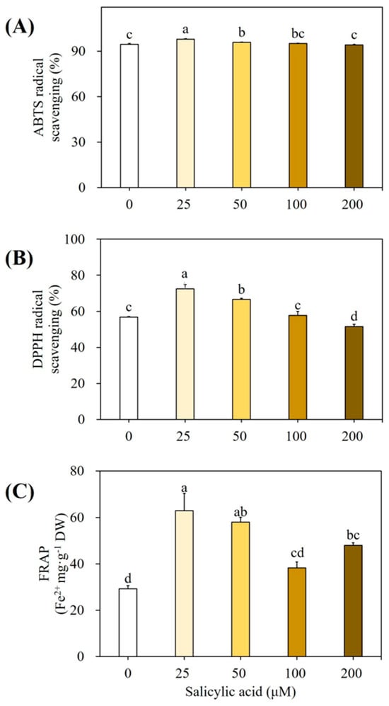 Figure 6 shows the antioxidant activity of extracts derived from plants treated with SA. As compared to the extracts of control plants, the extract of 25 µM SA-treated plants showed higher levels of ABTS (97.98%; Figure 6A), DPPH (72.43%; Figure 6B), scavenging activities, and antioxidant power as per FRAP assay (62.90 Fe2+ mg g−1 DW; Figure 6C).