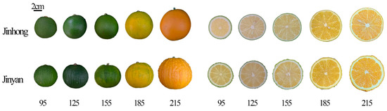 The physical indices were measured at all experimental intervals for ‘Jinhong’ and ‘Jinyan’ fruits from 95 DAF (immature stage) to 215 DAF (fully ripened stage) (Figure 1). Visually, ‘Jinhong’ fruits had smooth peels, whereas ‘Jinyan’ fruits developed multiple longitudinally irregularly arranged ridge-like protrusions; the peel color of both cultivars turned uniformly orange during ripening (Figure 1). At 95 DAF, ‘Jinyan’ had a significantly lower b* (yellow–blue) value and lower CCI but a significantly higher a* (red–green) value than ‘Jinhong’ did (Figure 1B–D). This trend continued at 185 DAF, as ‘Jinyan’ remained redder (higher a* value) than ‘Jinhong’ did. In the other stages, the differences in peel color were not significant (Figure 1A–D).