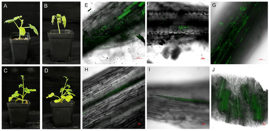 Phenotypes of watermelon seedlings (S: susceptible, FW-susceptible watermelon variety W1-1, and R: resistant, FW-resistant watermelon variety PI 296341) after 8 days of Fon (Fusarium oxysporum f. sp. niveum race 1) and water treatment and confocal laser scanning microscopic analysis of Fon-GFP colonization in S. (A) S seedlings after 8 days of water treatment. (B) S seedlings after 8 days of Fon inoculation. (C) R seedlings after 8 days of water treatment. (D) R seedlings after 8 days of Fon inoculation. Scale bar = 1.5 cm. (E) At 1 dpi, Fon-GFP attached to the surface of watermelon roots began to germinate. (F) At 2 dpi, Fon-GFP on the surface of watermelon roots began to exhibit dense hyphal proliferation. (G) Between 4 and 5 dpi, Fon-GFP hyphae penetrated the intercellular spaces along the edges of root cells. (H,I) Longitudinal section of the root. At 6 dpi, hyphae were observed to extend into the xylem vessels. (J) In transverse sections of the root, extensive colonization of hyphae in the xylem vessels was observed at 8 dpi. Fluorescence was excited at 488 nm and emitted light between 520 and 540 nm. Scale bar = 50 µm.